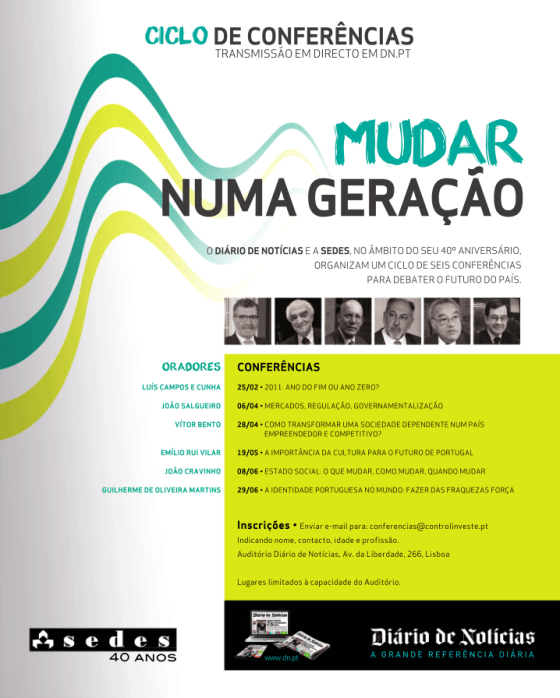 No âmbito do seu 40º aniversário, a SEDES organizará 6 Encontros Públicos, conduzidos por Presidentes e Fundadores, que se propôem perspectivar o futuro de Portugal para além do curto prazo.