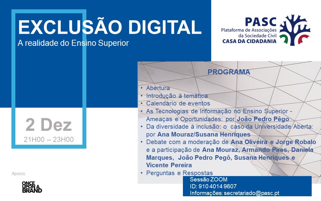 pasc – cartaz – exclusão digital – a realidade do ensino superior Publicado em Novembro 27, 2020Novembro 27, 2020 por casadacidadania PartilharCarregue aqui para partilhar no Twitter (Opens in new window)Clique para partilhar no Facebook (Opens in new window)Carregue aqui para partilhar por email com um amigo (Opens in new window)Gostar disto:Gosto Carregando...
