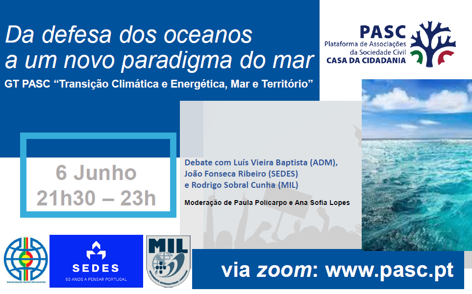 6 de Junho: 2º Debate do GT PASC “Transição Climática e Energética, Mar e Território”, com Luís Vieira Baptista (ADM), João Fonseca Ribeiro (SEDES) e Rodrigo Sobral Cunha (MIL) Publicado em Abril 24, 2023Maio 9, 2023 por casadacidadania Entrar na reunião Zoomhttps://us06web.zoom.us/j/87862524475 ID da reunião: 878 6252 4475 Partilhar Click to share on X (Abre numa nova janela) X Clique para partilhar no Facebook (Abre numa nova janela) Facebook Carregue aqui para enviar por email a um amigo (Abre numa nova janela) E-mail Gosto Carregando... Relacionado