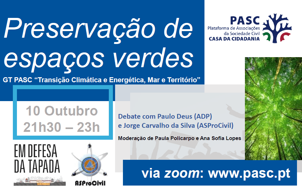 10 de Outubro: 4º Debate do GT PASC “Transição Climática e Energética, Mar e Território”: Preservação de espaços verdes… Publicado em Outubro 6, 2023 por casadacidadania Entrar Zoom Reuniãohttps://us06web.zoom.us/j/82026687937 ID da reunião: 820 2668 7937 Partilhar Click to share on X (Abre numa nova janela) X Clique para partilhar no Facebook (Abre numa nova janela) Facebook Carregue aqui para enviar por email a um amigo (Abre numa nova janela) E-mail Gosto Carregando... Relacionado