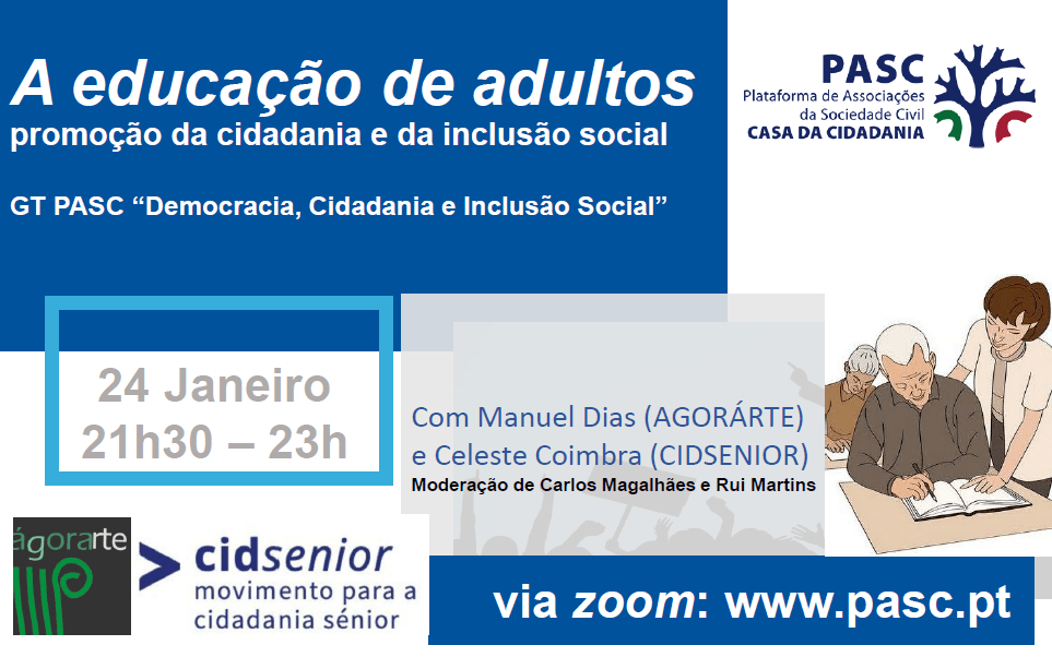 24 de Janeiro: 6º Debate do GT PASC “Democracia, Cidadania e Inclusão Social”, com Manuel Dias (AGORÁRTE) e Celeste Coimbra (CIDSENIOR) Publicado em Janeiro 17, 2024 por casadacidadania Entrar Zoom Reuniãohttps://us06web.zoom.us/j/85709927726 ID da reunião: 857 0992 7726 Partilhar Click to share on X (Abre numa nova janela) X Clique para partilhar no Facebook (Abre numa nova janela) Facebook Carregue aqui para enviar por email a um amigo (Abre numa nova janela) E-mail Gosto Carregando... Relacionado