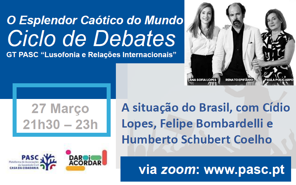 27 de Março: 16ª sessão do Ciclo “O Esplendor Caótico do Mundo” (GT PASC “Lusofonia e Relações Internacionais”): a situação do Brasil… Publicado em Março 19, 2024 por casadacidadania Entrar Zoom Reuniãohttps://us06web.zoom.us/j/82218770434 ID da reunião: 822 1877 0434 Partilhar Click to share on X (Abre numa nova janela) X Clique para partilhar no Facebook (Abre numa nova janela) Facebook Carregue aqui para enviar por email a um amigo (Abre numa nova janela) E-mail Gosto Carregando... Relacionado