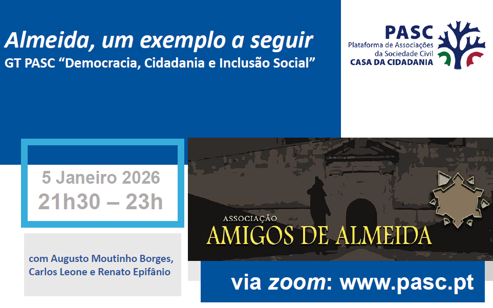 5 de Janeiro – 24ª sessão do GT PASC “Democracia, Cidadania e Inclusão Social”: com a Associação dos Amigos de Almeida… Publicado em Dezembro 27, 2025 por casadacidadania Ingressar na reunião Zoomhttps://us06web.zoom.us/j/81451717166 ID da reunião: 814 5171 7166 Partilhar Click to share on X (Abre numa nova janela) X Clique para partilhar no Facebook (Abre numa nova janela) Facebook Carregue aqui para enviar por email a um amigo (Abre numa nova janela) E-mail Gosto Carregando... Relacionado