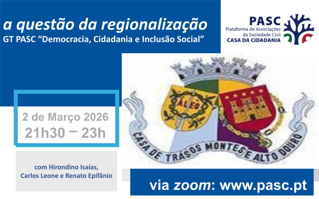 2 de Março – 26ª sessão do GT PASC “Democracia, Cidadania e Inclusão Social”: a questão da regionalização, com Hirondino Isaías, Presidente da Casa de Trás-os-Montes e Alto Douro… Publicado em Fevereiro 21, 2026 por casadacidadania Ingressar na reunião Zoomhttps://us06web.zoom.us/j/81451717166 ID da reunião: 814 5171 7166 Partilhar Share on X (Abre numa nova janela) X Partilhar no Facebook (Abre numa nova janela) Facebook Email a link to a friend (Abre numa nova janela) E-mail Gosto Carregando... Relacionado