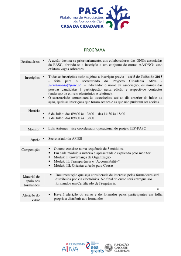 No âmbito do Contrato de Parceria celebrado em Março de 2014 entre o Programa Cidadania Ativa, o Promotor SEDES e a Entidade Parceira MIL, tendo em vista a execução do Projeto denominado IEP-PASC, insere-se a linha de ação L4 – Formação e Informação das ONG.