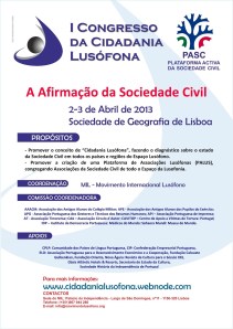 O II Congresso da Cidadania Lusófona será no dia 16 de Abril, de novo na Sociedade de Geografia de Lisboa. Uma vez mais coordenado pelo MIL – Movimento Internacional Lusófono e pela Sphaera Mundi – Museu do Mundo, no âmbito da PASC – Plataforma Activa da Sociedade Civil. Pretendemos com este Congresso sedimentar, desde logo, um novo conceito, o de Cidadania Lusófona, ampliar a PALUS – Plataforma de Associações Lusófonas, entretanto criada – que congrega já cerca de uma centena de Associações da Sociedade Civil de todo o espaço da Lusofonia –, dando em particular resposta à seguinte questão: “Que prioridades na cooperação lusófona?”.