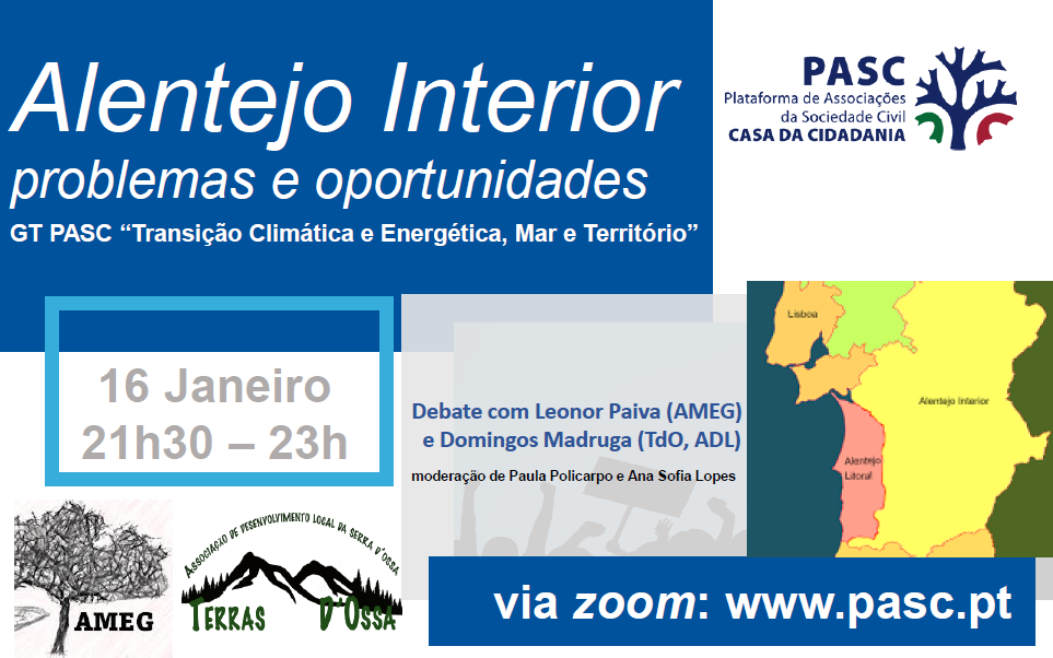 16 de Janeiro: 5º Debate do GT PASC “Transição Climática e Energética, Mar e Território”: Alentejo Interior, problemas e oportunidades, com duas novas Associações PASC…