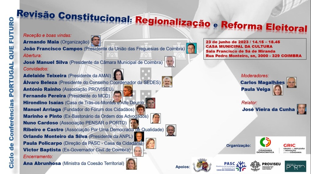 23 de Junho, em Coimbra, com o apoio da PASC: “Revisão Constitucional: Regionalização e Reforma Eleitoral”
